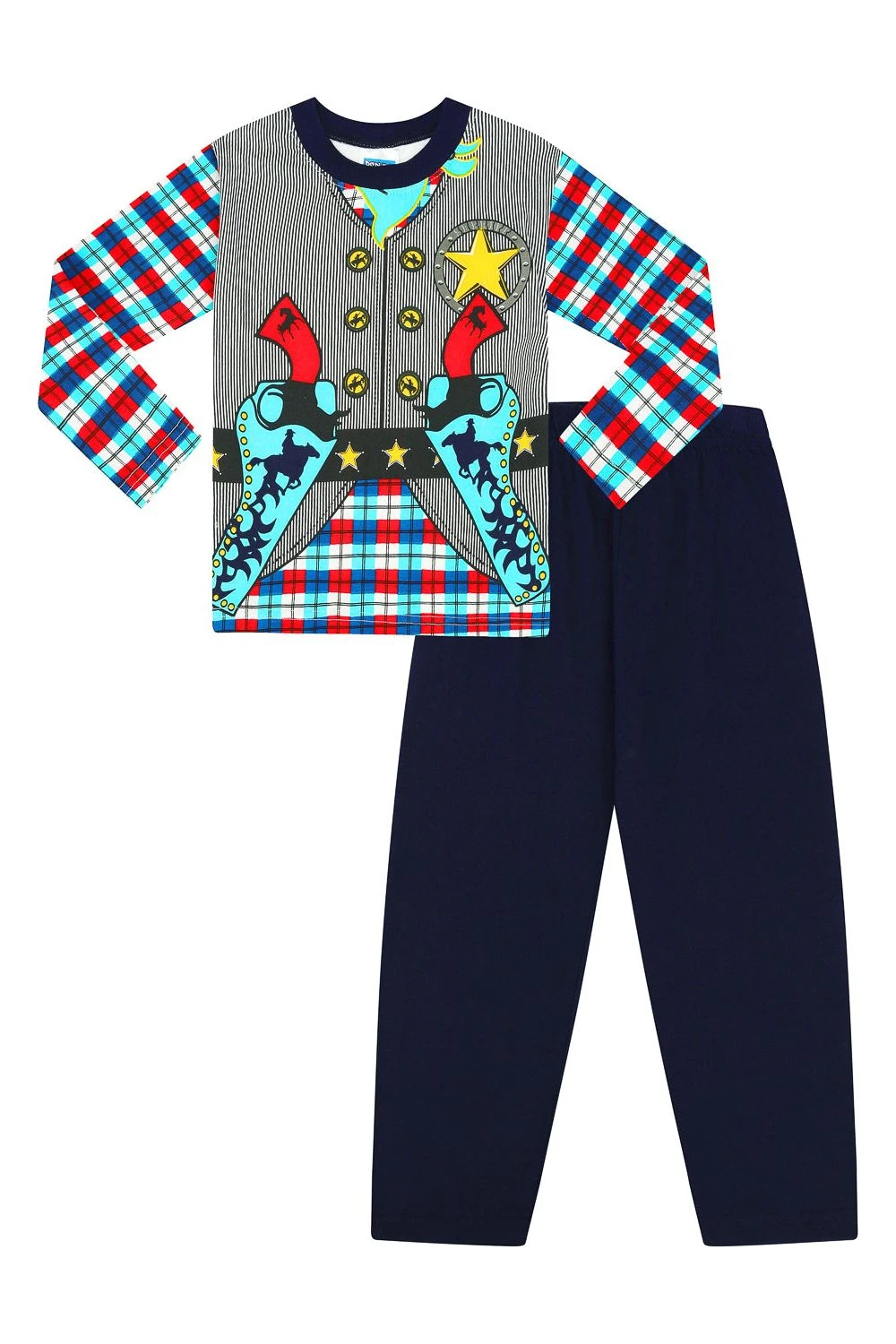 To dreamland and beyond! Cowboy Novelty Fancy Dress Pyjamas Long sleeved top with matching elasticated bottoms. This pyjama set is super comfy is sure to be a firm favourite in their pyjama drawer.
