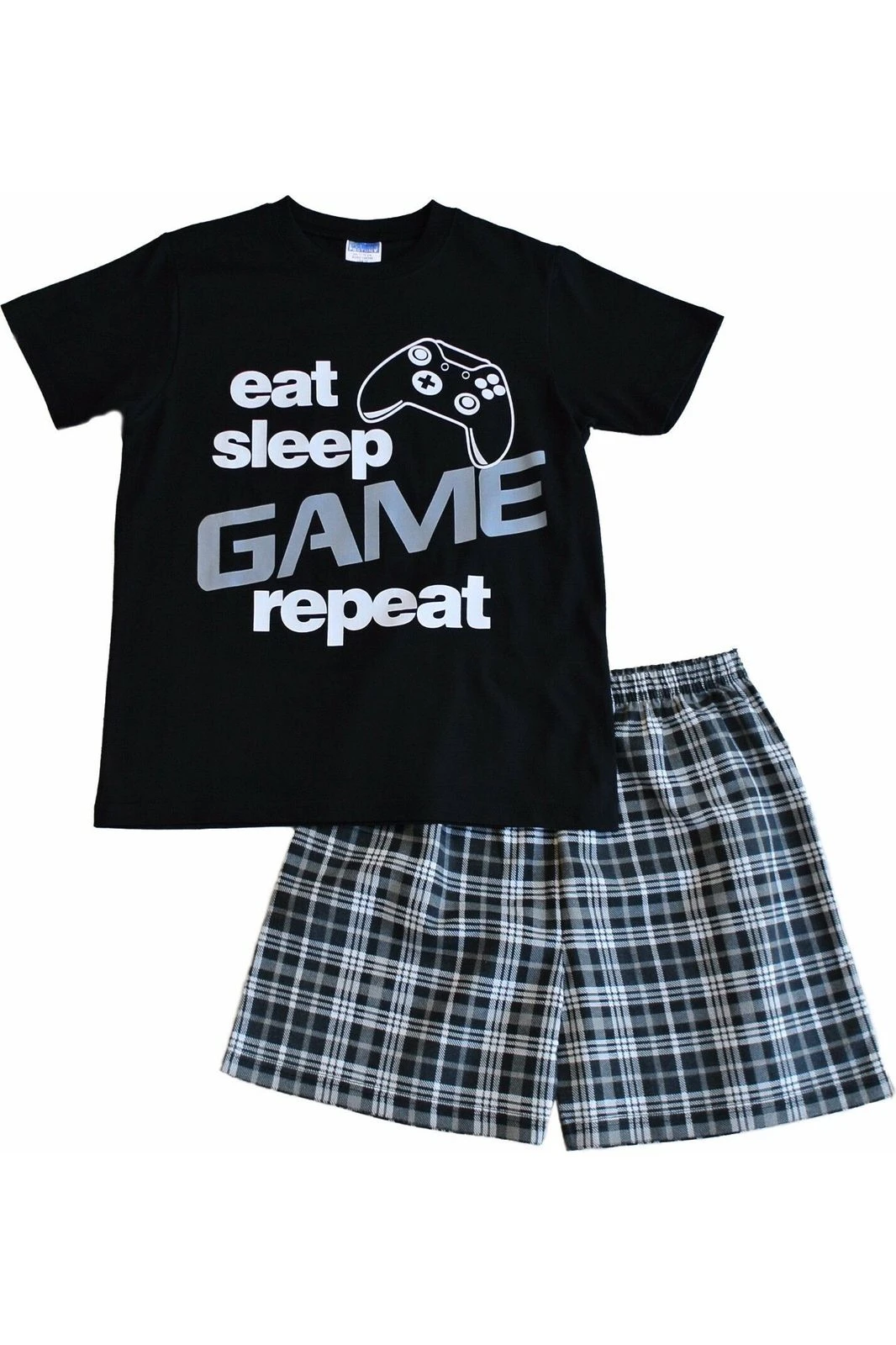 Exclusive to pyjamas.com – you will not find these anywhere else! These cheeky “Eat, Sleep, Game,” pyjamas feature a controller on the front of a short sleeved top with matching checkered shorts . These are sure to be a firm favourite in any