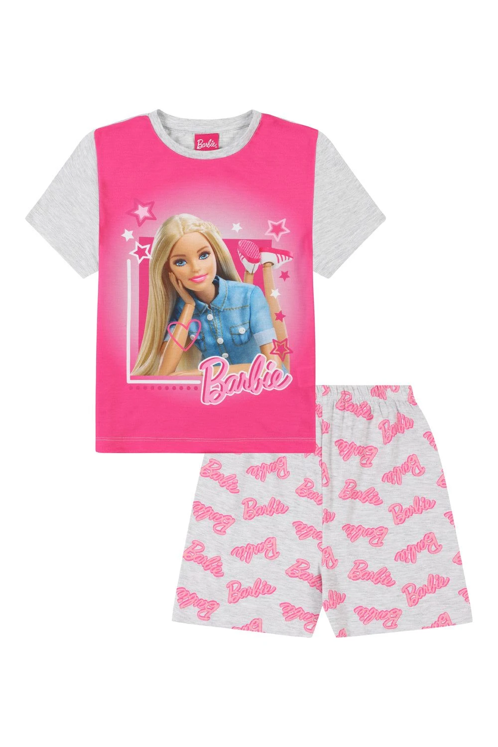 is perfect for any fan! Features Barbie girl printed across a short sleeved top with matching Barbie Logo short bottoms.
