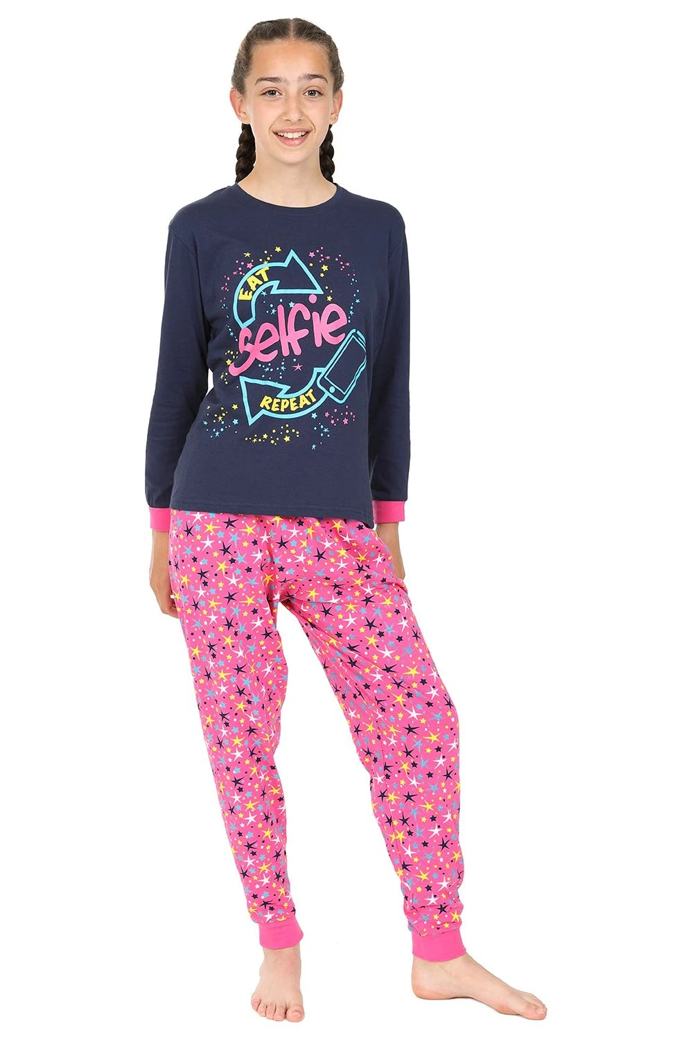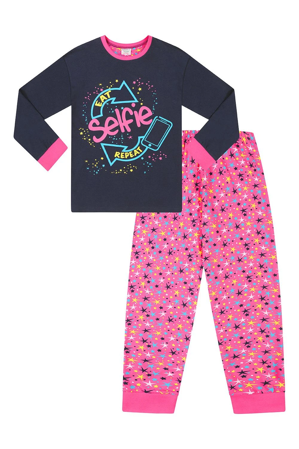 Lovely quality pyjama set features a cheeky “Eat Selfie Repeat” slogan on the front with matching bottoms.