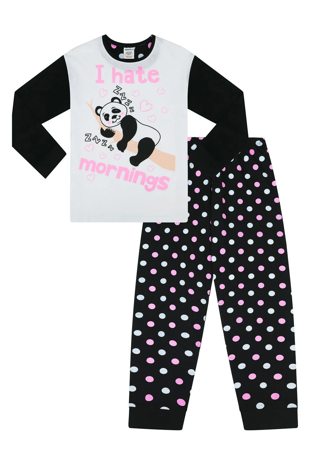 Cool girls pyjama set with a ” I Hate Mornings Panda Bear” slogan printed across the front .Set is complete with matching Polka Dot elasticated Long Bottoms. This will be a firm favourite in her pyjama drawer .