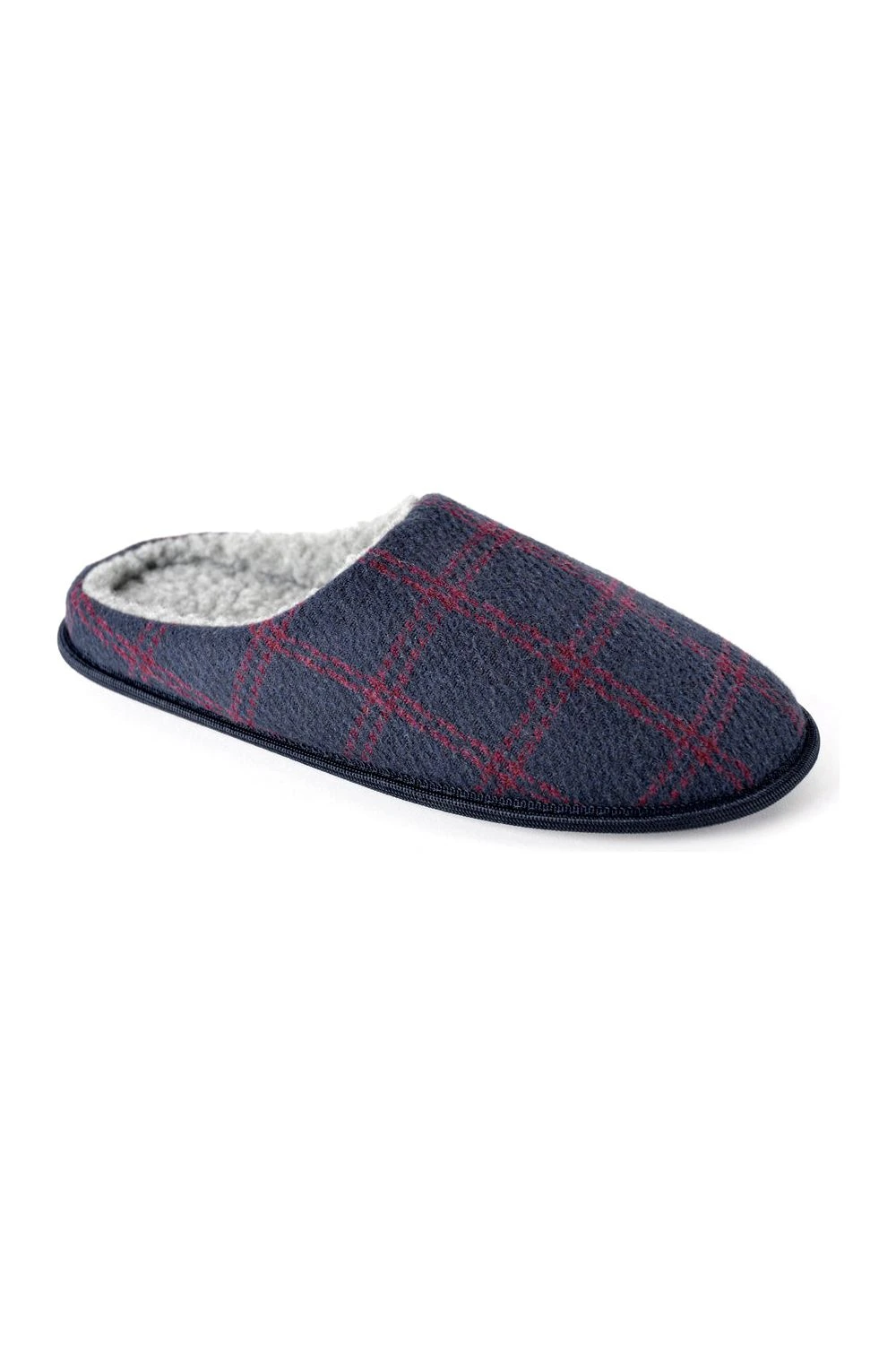 Men’s Navy And Red Checked Fleece Lined Slide On Mule Slippers