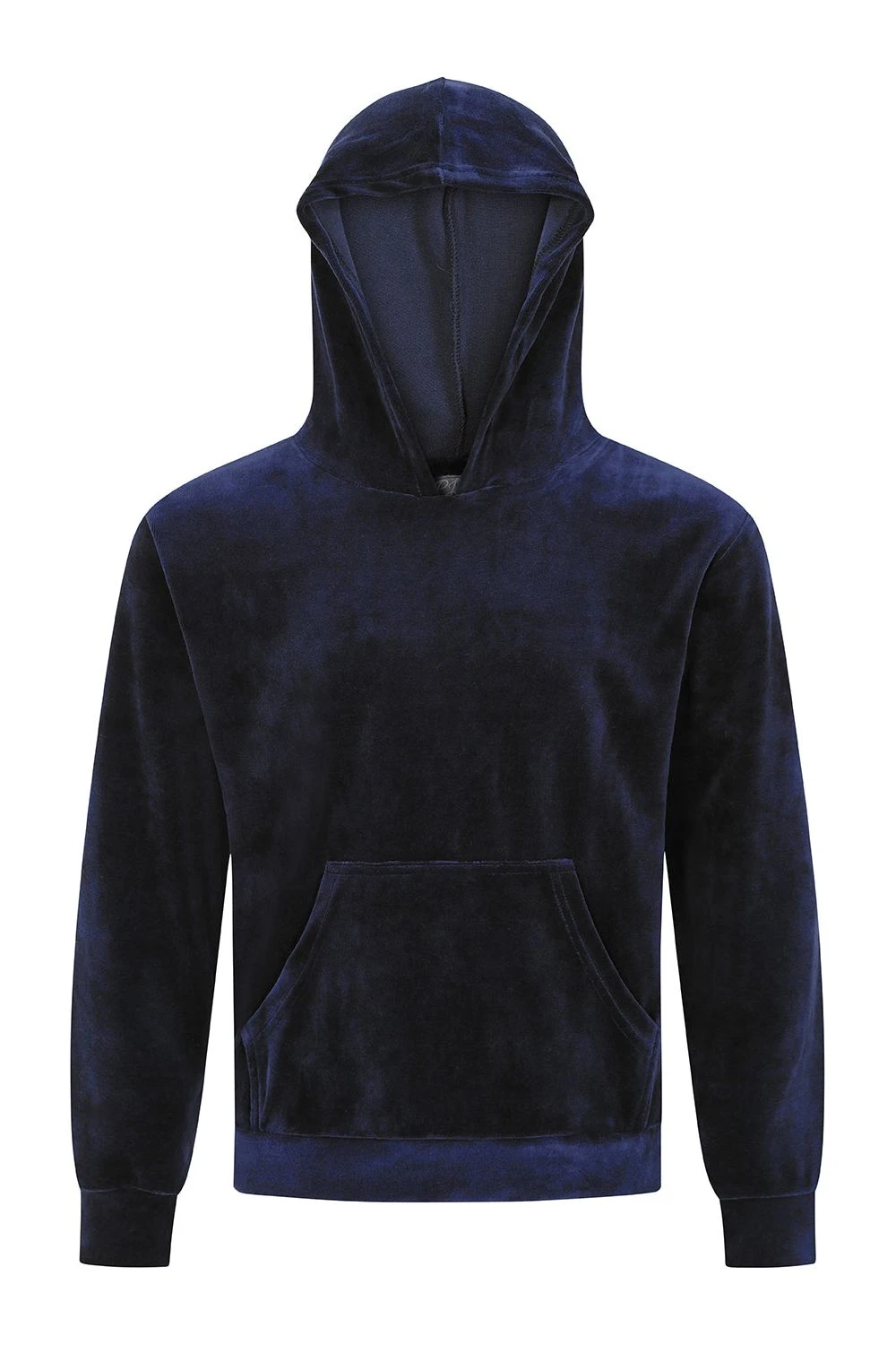 Ladies Navy velour two piece pull on hooded long sleeved top and matching long bottoms with elasticated waistband. Perfect for a night on the sofa.