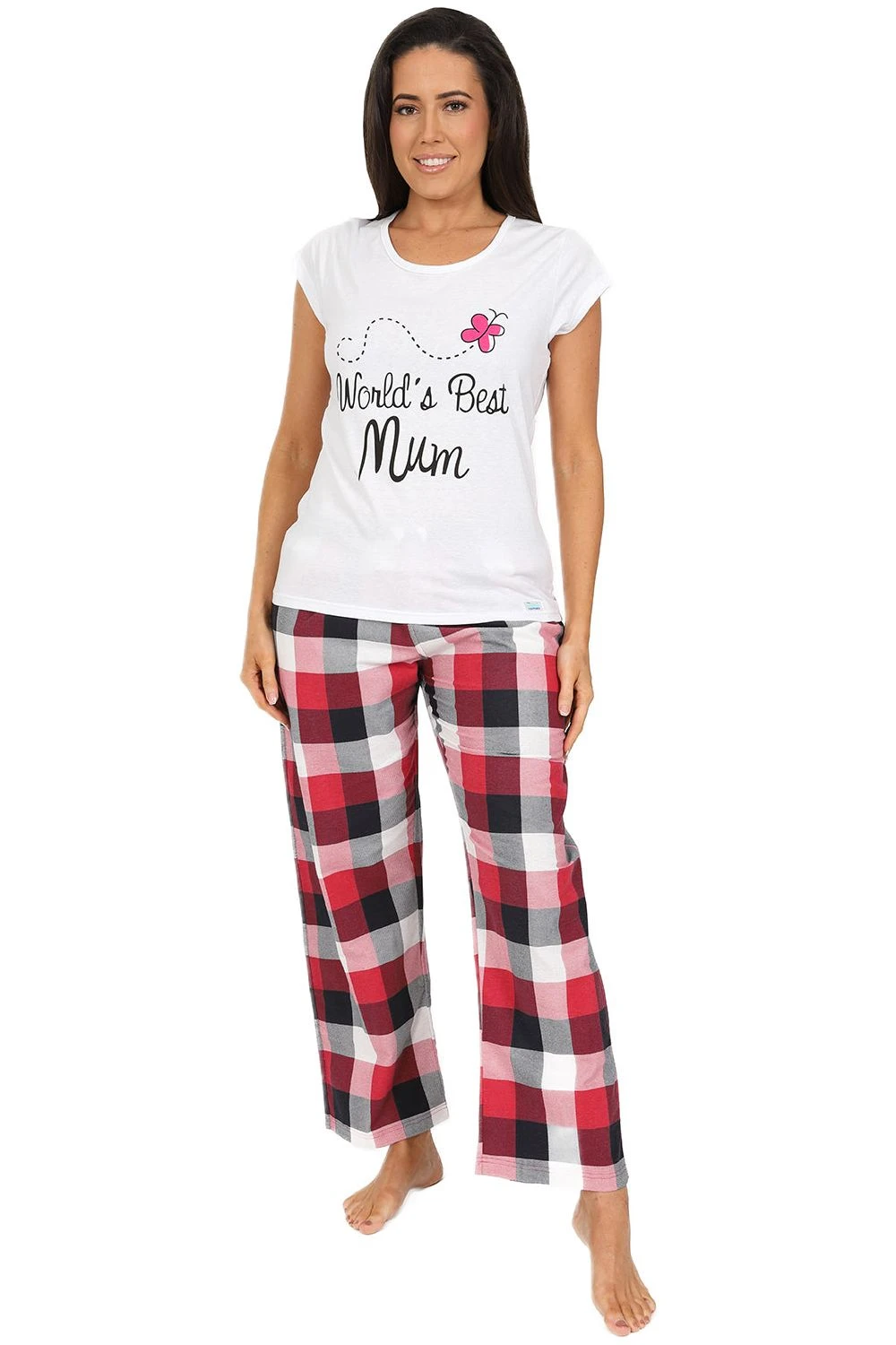 A super cool ladies Pyjama set with a lovely “World’s Best MUM ” slogan across the front. These short sleeved and Long Leg woven Check Pyjamas. Perfect for